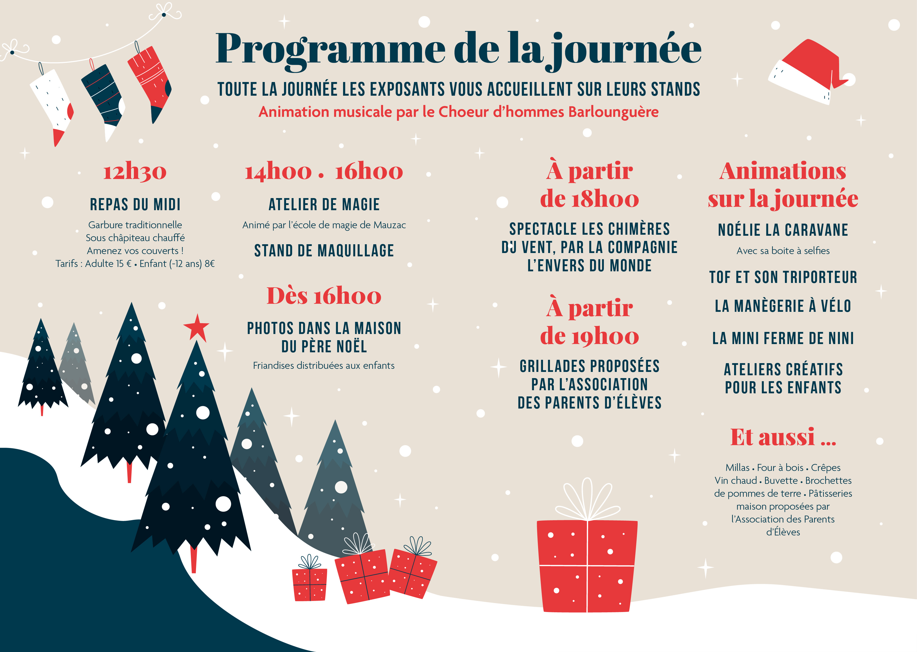 Venez profiter de cette belle journée, déambuler entre les stands d’artisans locaux, profiter des diverses animations pour les petits et les grands, rencontrer le Père-Nöel, et vous régaler avec la fameuse boisson de Nöel : le vin chaud et ses diverses épices ainsi que des gourmandises sucrées et salées. Chacun pourra trouver son bonheur dans ce merveilleux Marché de Nöel.