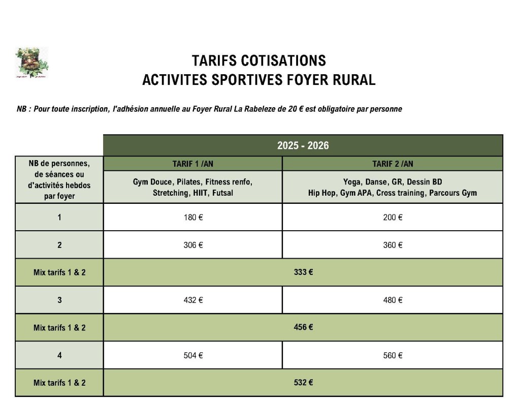 Voici les tarifs concernant les activités sportives proposées par le Foyer Rural pour la saison 2025-2026